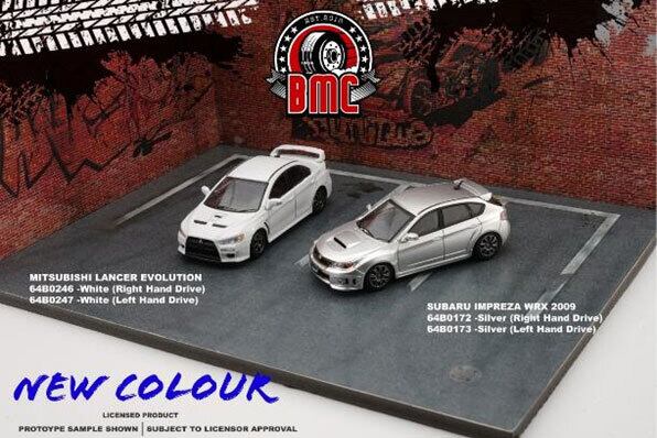 BM Creations による 1/64 スケールモデルで、三菱 ランサー EVO X(ホワイト/右ハンドル仕様)を再現。リアルな造形と塗装で実車のデザインを細部まで表現。