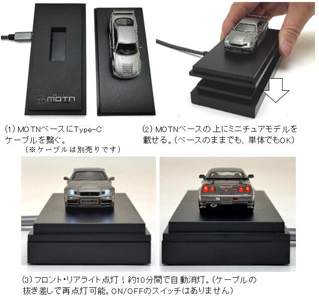 KYOSHOオリジナル 1/64 MOTN LED ベースシステム は、京商オリジナルの 1/64 スケールミニカー用 非接触式給電ベース(LED点灯ギミック付き) です。MOTN シリーズ対応ミニカーをベースに乗せるだけで、LED が点灯する仕組みを搭載しています。