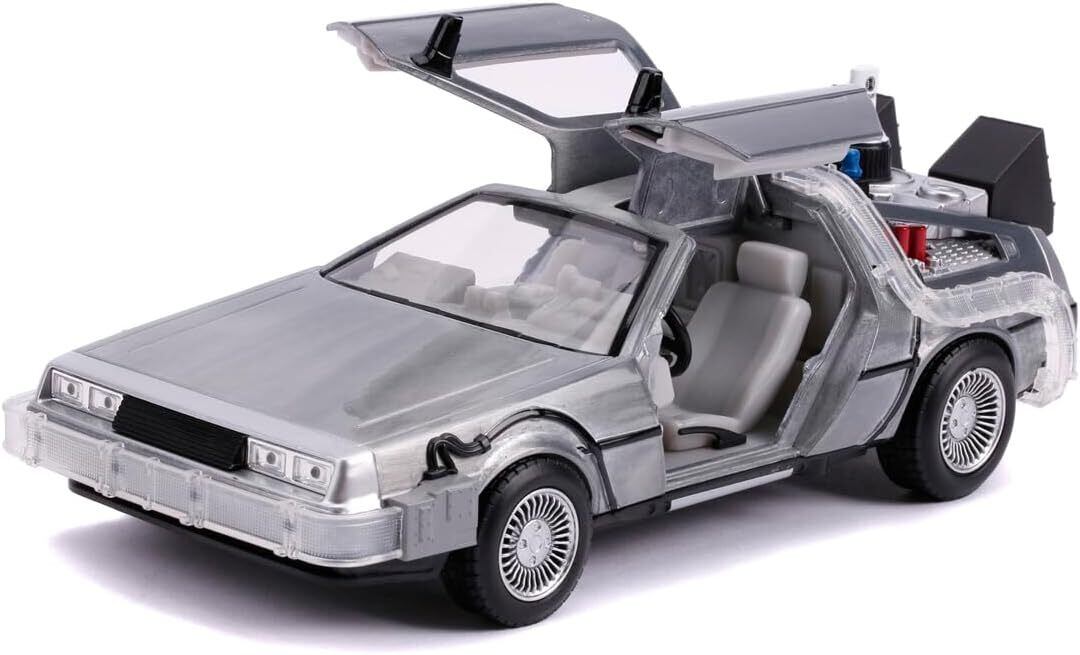 本商品は JADA TOYS(ジャダトイズ) がリリースする 1/24 スケール完成品ダイキャストミニカー で、映画『バック・トゥ・ザ・フューチャー パート II(Back to the Future II)』に登場する象徴的なタイムマシーン DeLorean DMC-12 をモデル化したアイテムです。オリジナル映画の世界観を再現するために、フロント/リアのライト点灯ギミックを搭載。また、付属のギミックで フライングモード(飛行形態) に変形させることもでき、映画ファンやコレクターに人気の高い完成品モデルです。