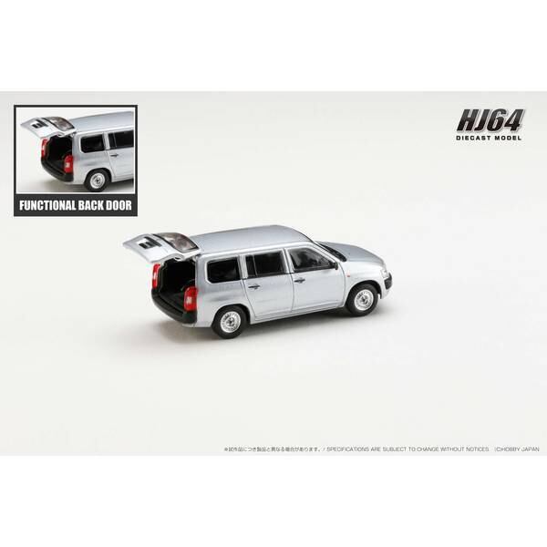 本商品は Hobby Japan(ホビージャパン) が展開する 1/64 スケール完成品ダイキャストミニカー HJ64 シリーズ の一台で、日常の働く車として人気の高い トヨタ プロボックスバン DX をモデル化した完成品です。ステンレス調の シルバーメタリック塗装 が施されたボディは実車の印象を忠実に再現。バックドアが 開閉可能なギミック を備え、遊び心とリアリティを両立させています。