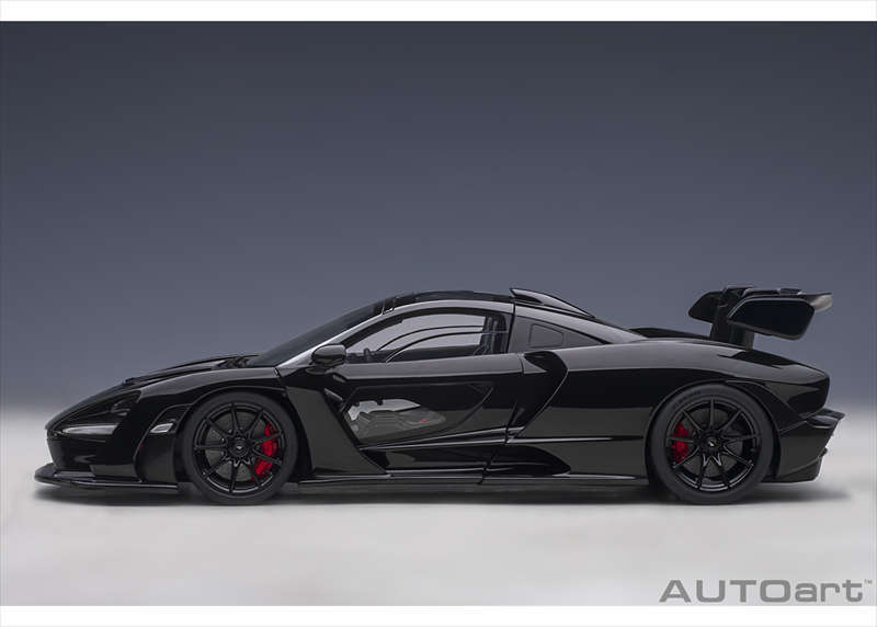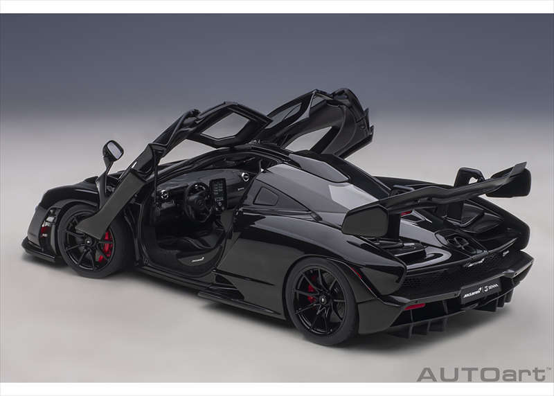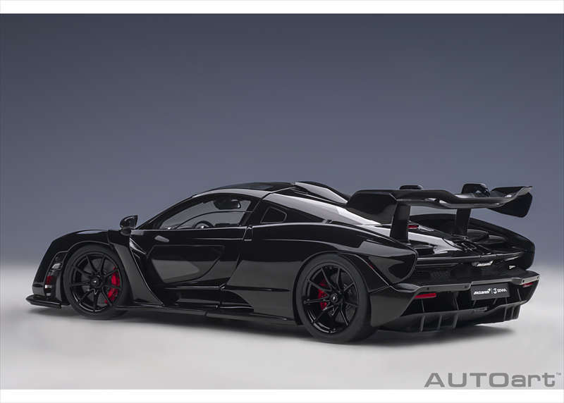 実車マクラーレン セナのアグレッシブなエアロダイナミクスデザインや低く構えたフォルムを、1/18スケールで精密に再現した完成品モデルとなっています。