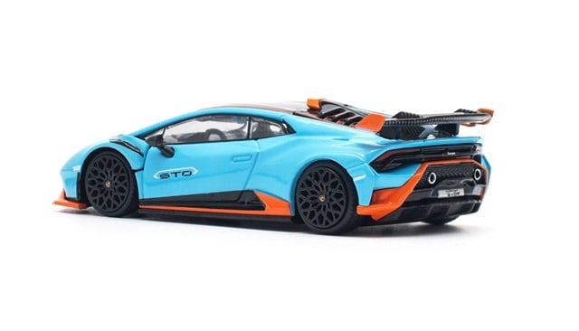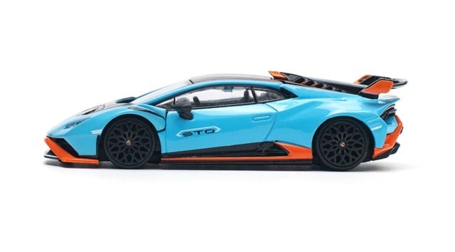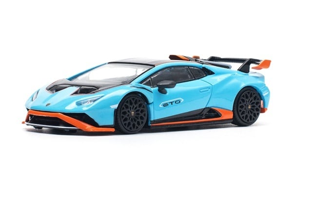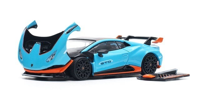 ウラカン STO(Super Trofeo Omologata)の特徴的なエアロデザインとレーシングスタイルを1/64スケールで表現。